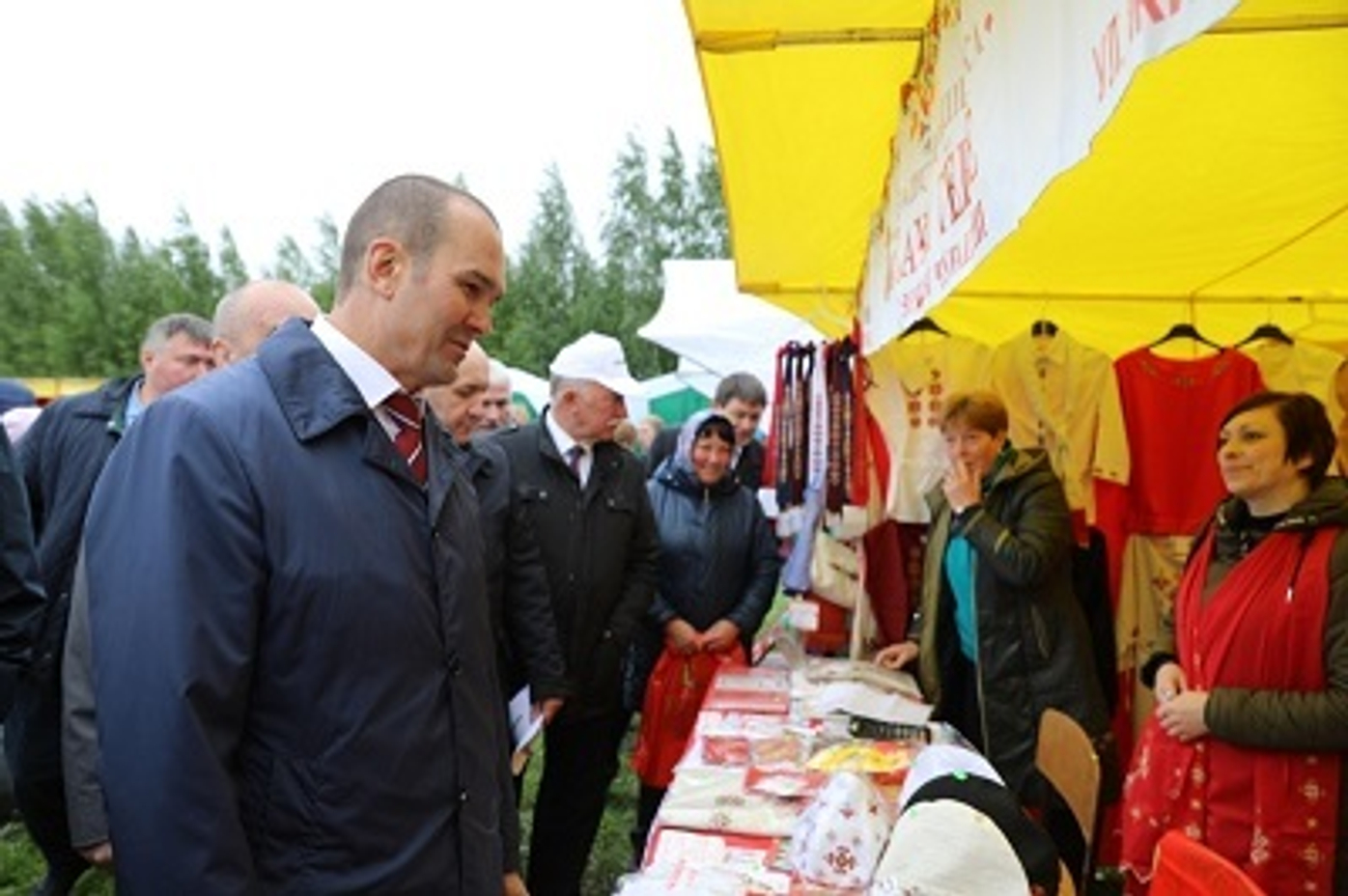 Глава Чувашии Михаил Игнатьев и сопровождающие его лица познакомились с тематическими площадками, в т.ч. и выставкой Фирмы художественных промыслов «Паха тере».